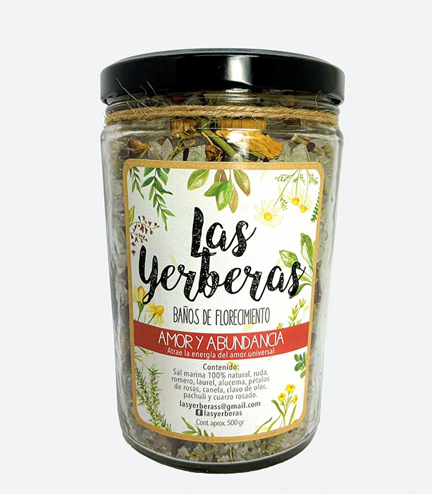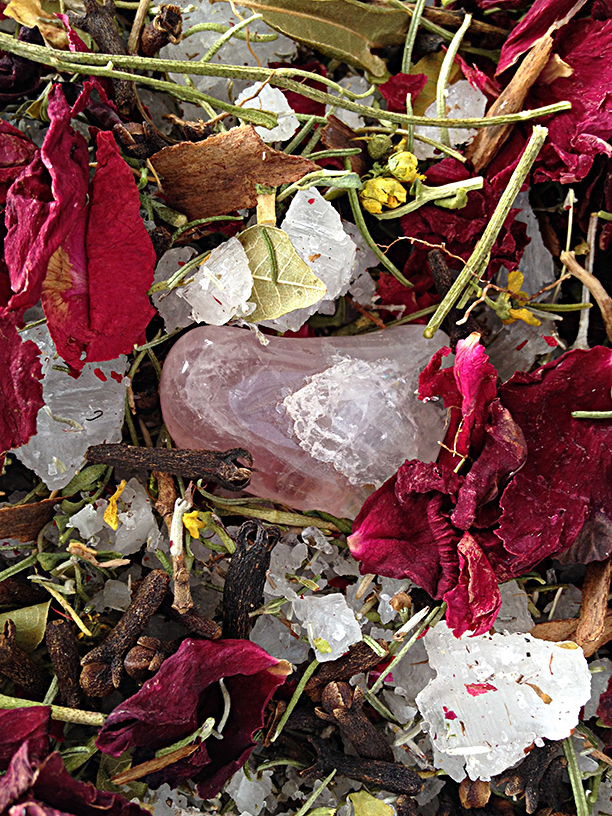 Ingredientes: Sal marina, Ruda, Romero, Laurel, Alucema, Pétalos de rosas, Clavo de olor, Canela, Pachuli y Cuarzo Rosado.